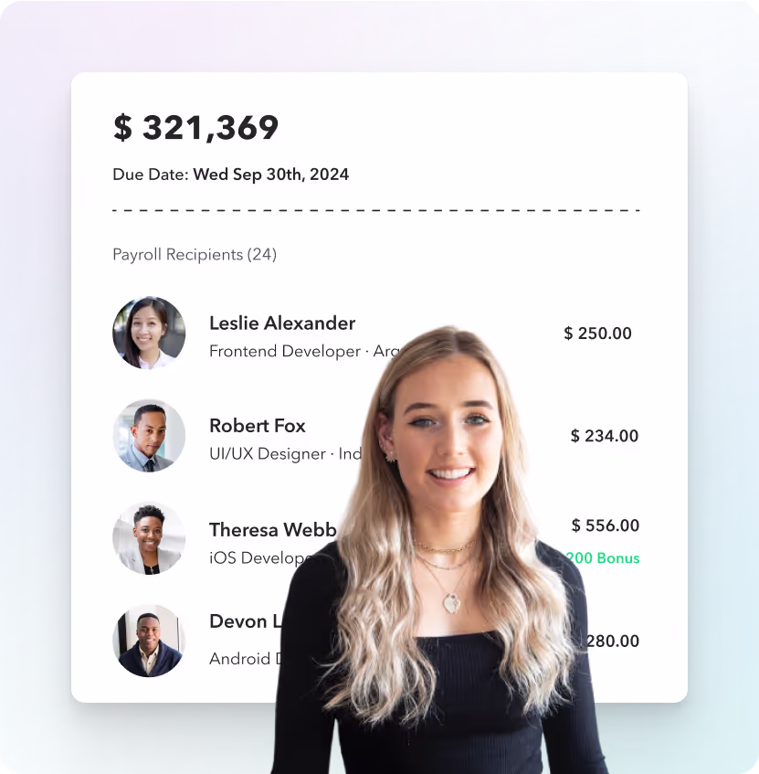 Pay your contractors and employees on time and in their currency of choice with optimal exchange rates. Manage payments, taxes, deductions and payslips for your remote team from a single platform.