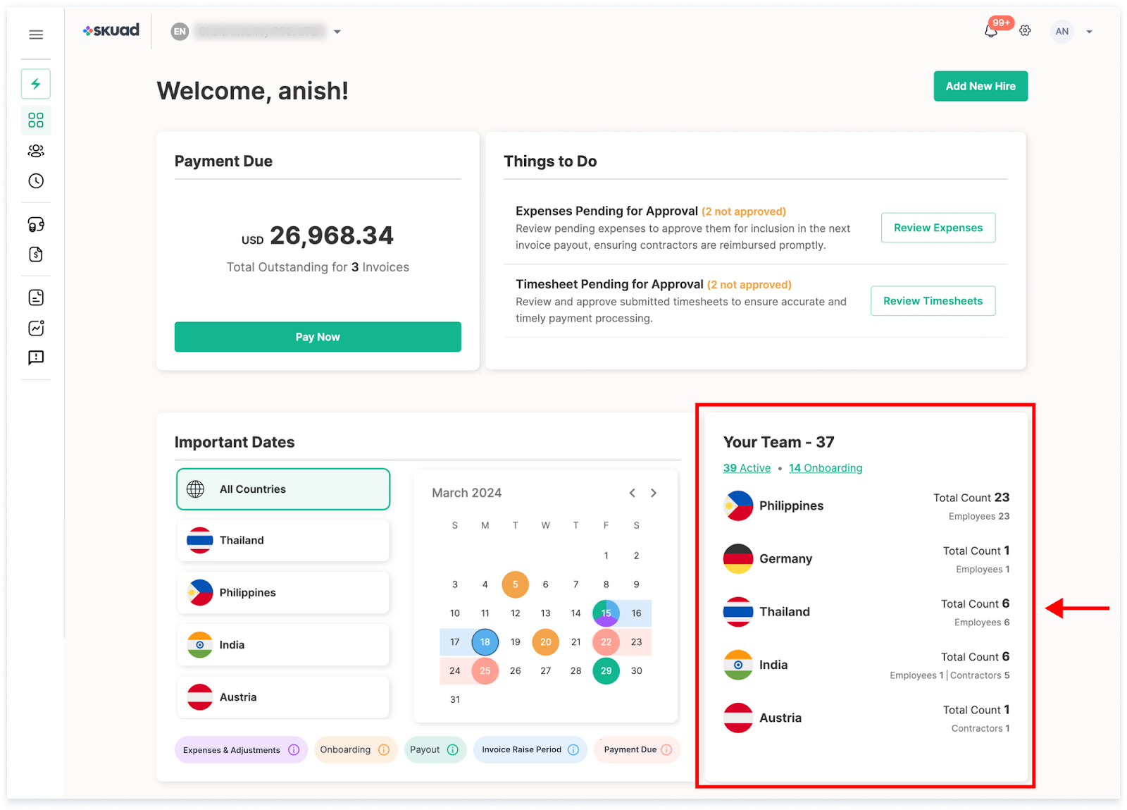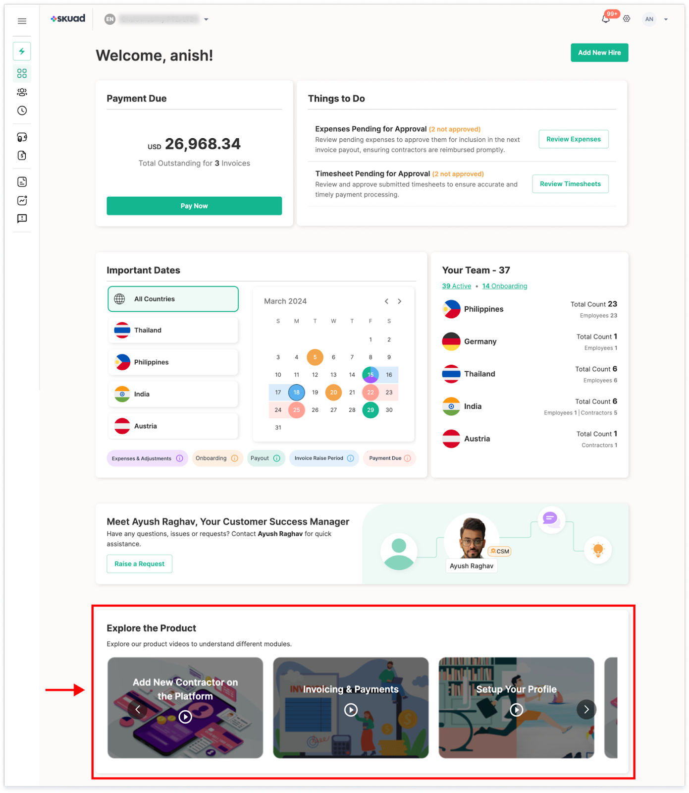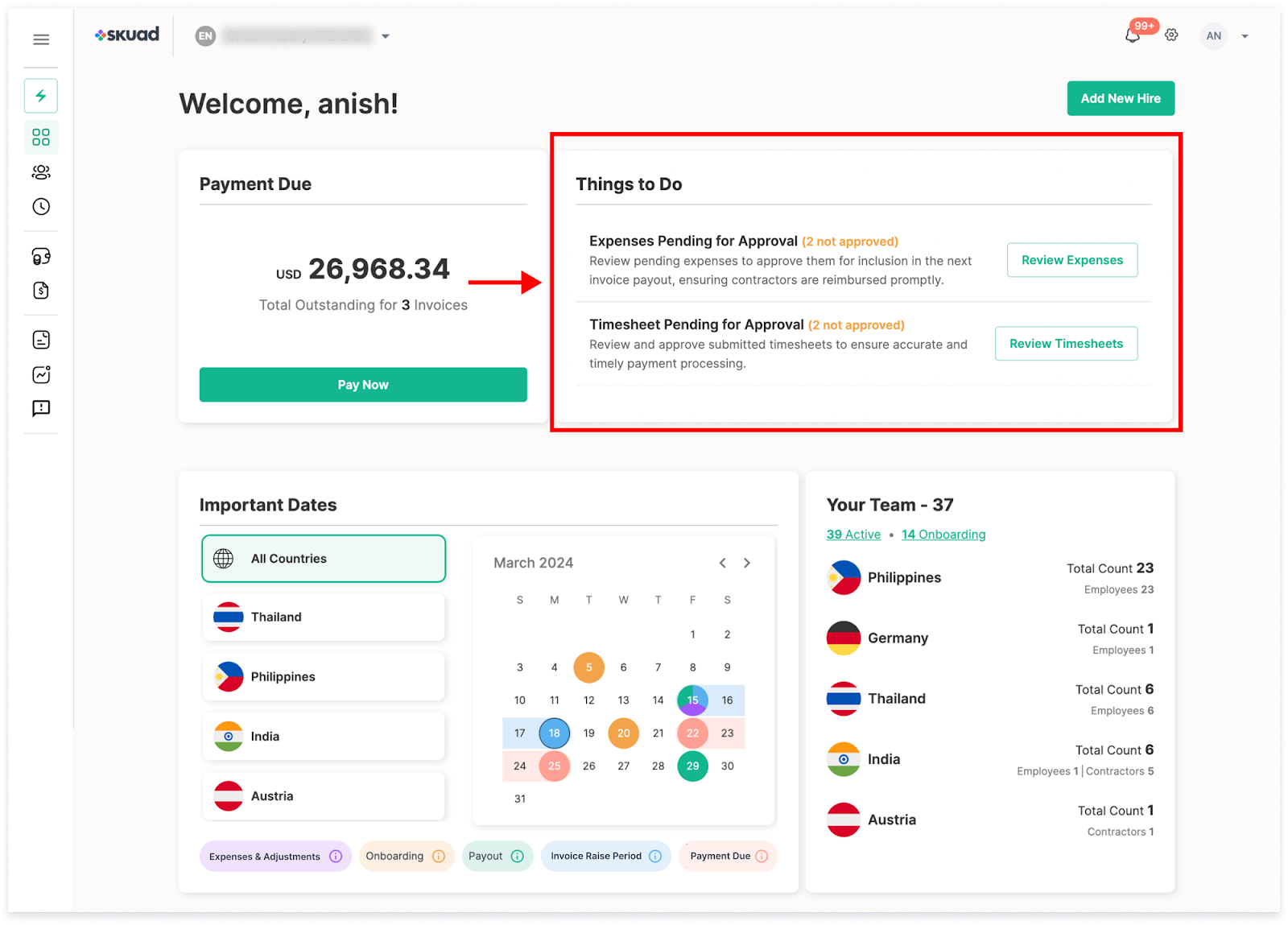 The new Skuad dashboard has been designed to provide an intuitive and informative experience. It remains your landing page once you sign in to the platform & it acts as the central hub for managing your payments, tasks, and workforce.
