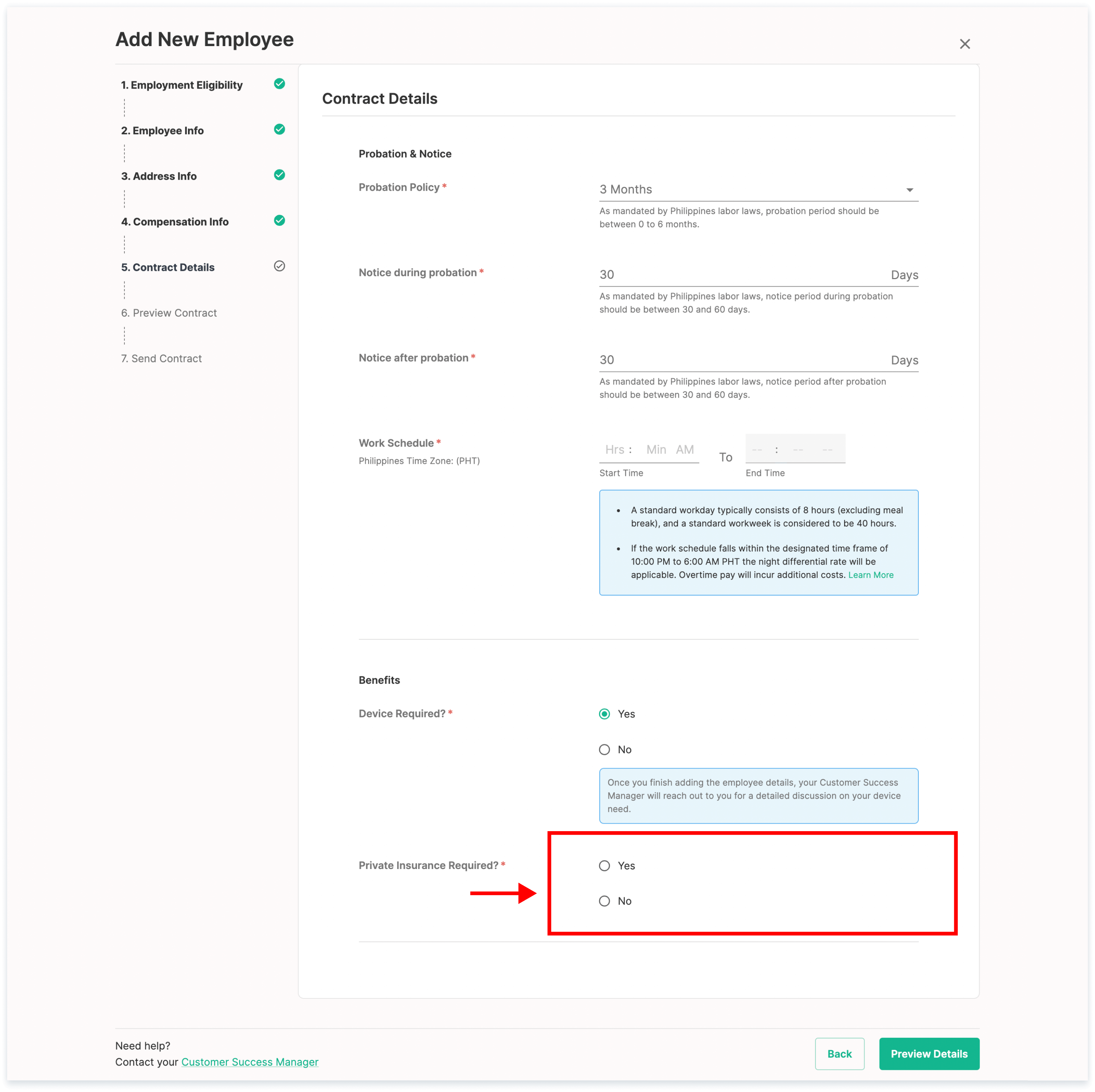 Option 1: While adding a new employee on the platform, choose ‘Yes’ against ‘Private Insurance Required’. Our onboarding team will then get back with insurance details and price for your further confirmation.