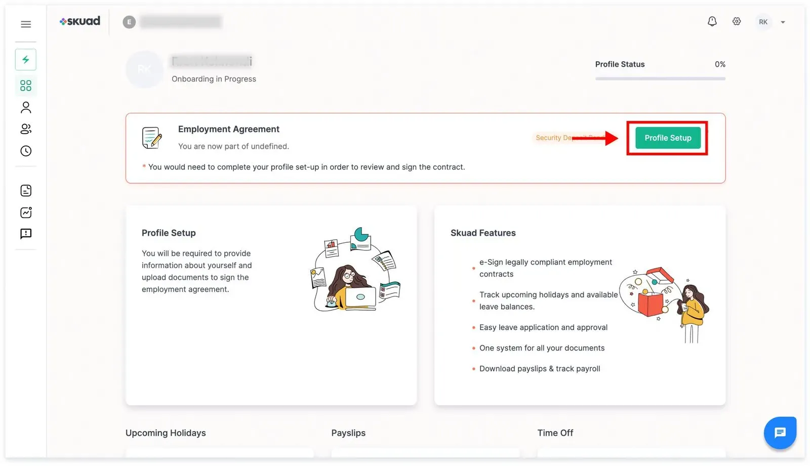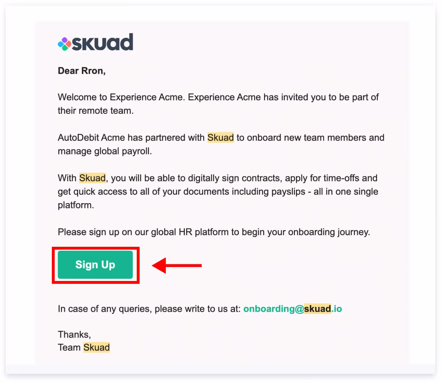 Step 1: You will receive a welcome email from Skuad on the email provided by your employer. Click on ‘Sign Up’ to start.