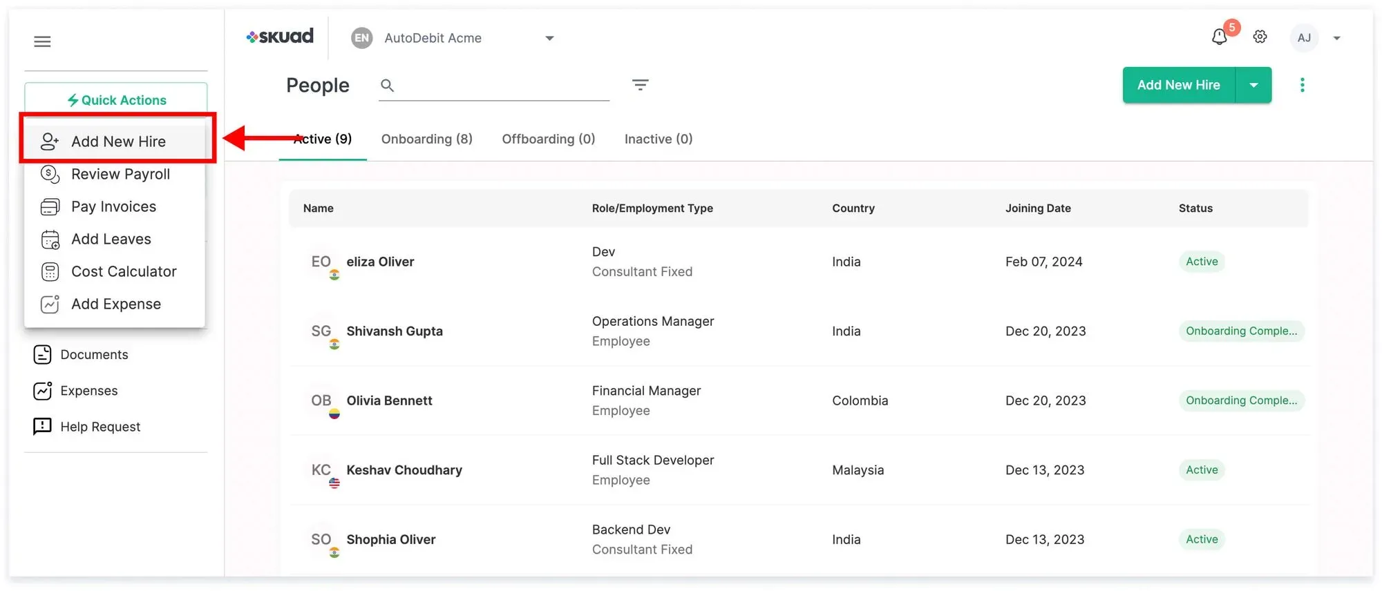 a) Once you log on to Skuad’s platform, navigate to the ‘People’ section. Click on the ‘Add New Hire’.