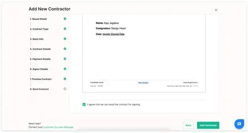Step 11: Once you are satisfied with the contract you can provide confirmation to send the contract to your contractor by checking the box and clicking on ‘Add Contractor’.