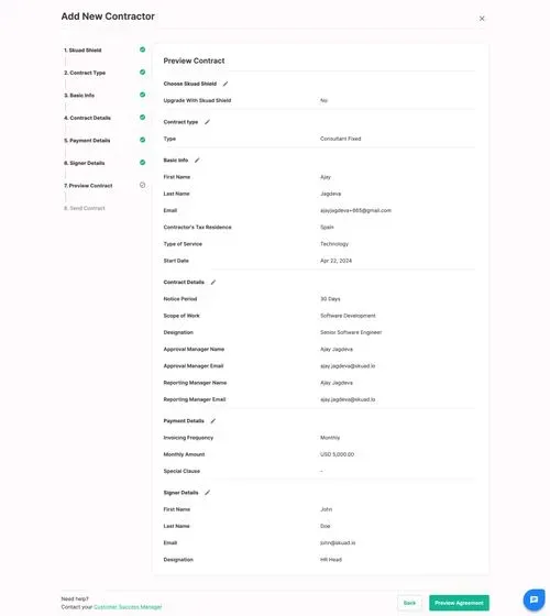 Step 9: If you are yet to sign the contract, Skuad provides the option to create your own contract. Add the required details to generate a contract in your name. Alternatively, you can proceed without signing a contract.