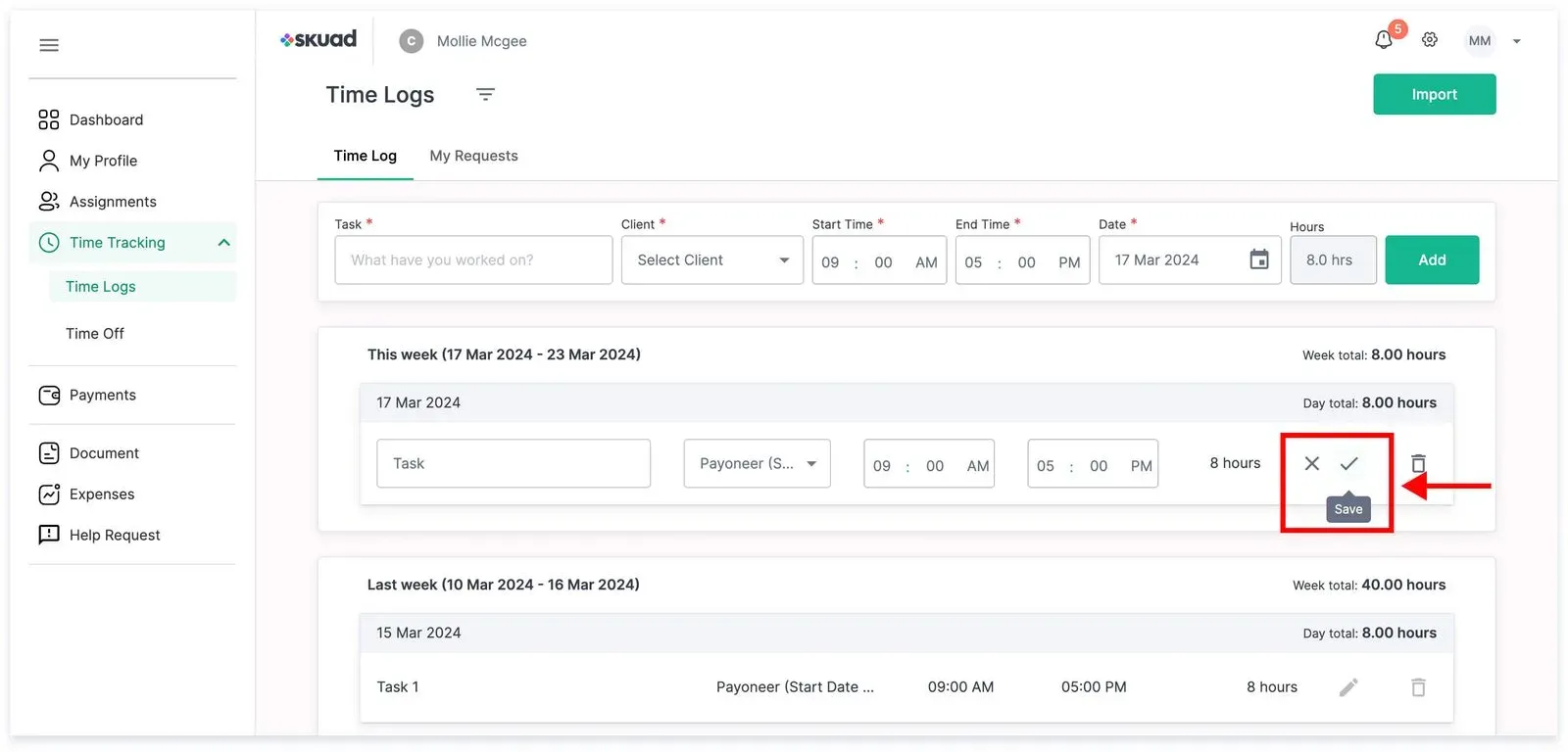 Step 1: Log into the platform and navigate to the ‘Time Tracking’ tab on the side panel. Here, select the ‘Time Logs’ option.