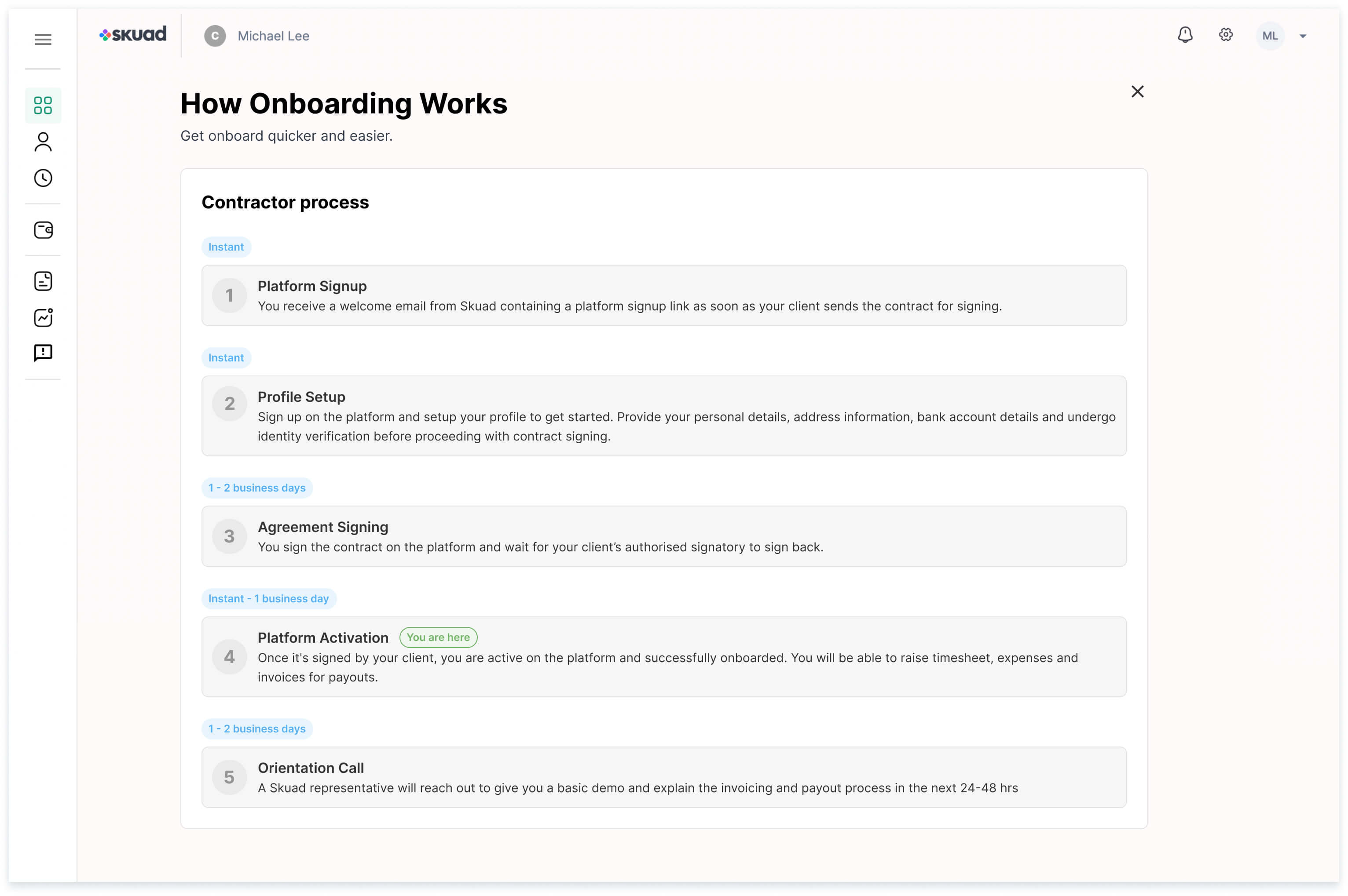 You've completed the signing process for your contract. The employer has been notified, and they will now review and sign the contract. Once this is done, you'll be activated on the platform. We'll inform you once this step is completed. For more details on the next steps, click on 'learn more' in the banner.