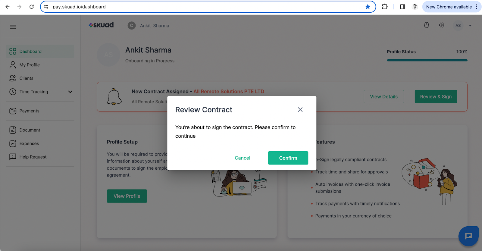 Step 2: Once your profile is tagged as ‘100% Completed’, you can ‘Review & Sign’ your contractor agreement directly from the dashboard.