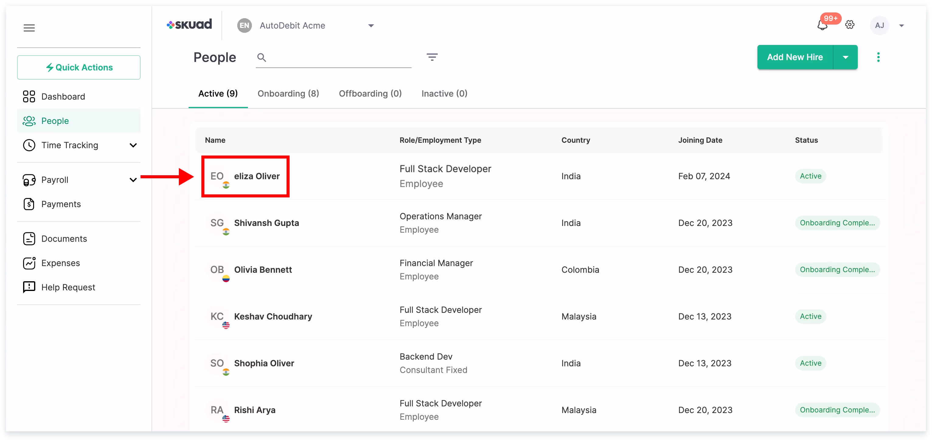 Step 2: The ‘People’ section will present the list of employees you've hired. Simply click on an employee's name to access their details.