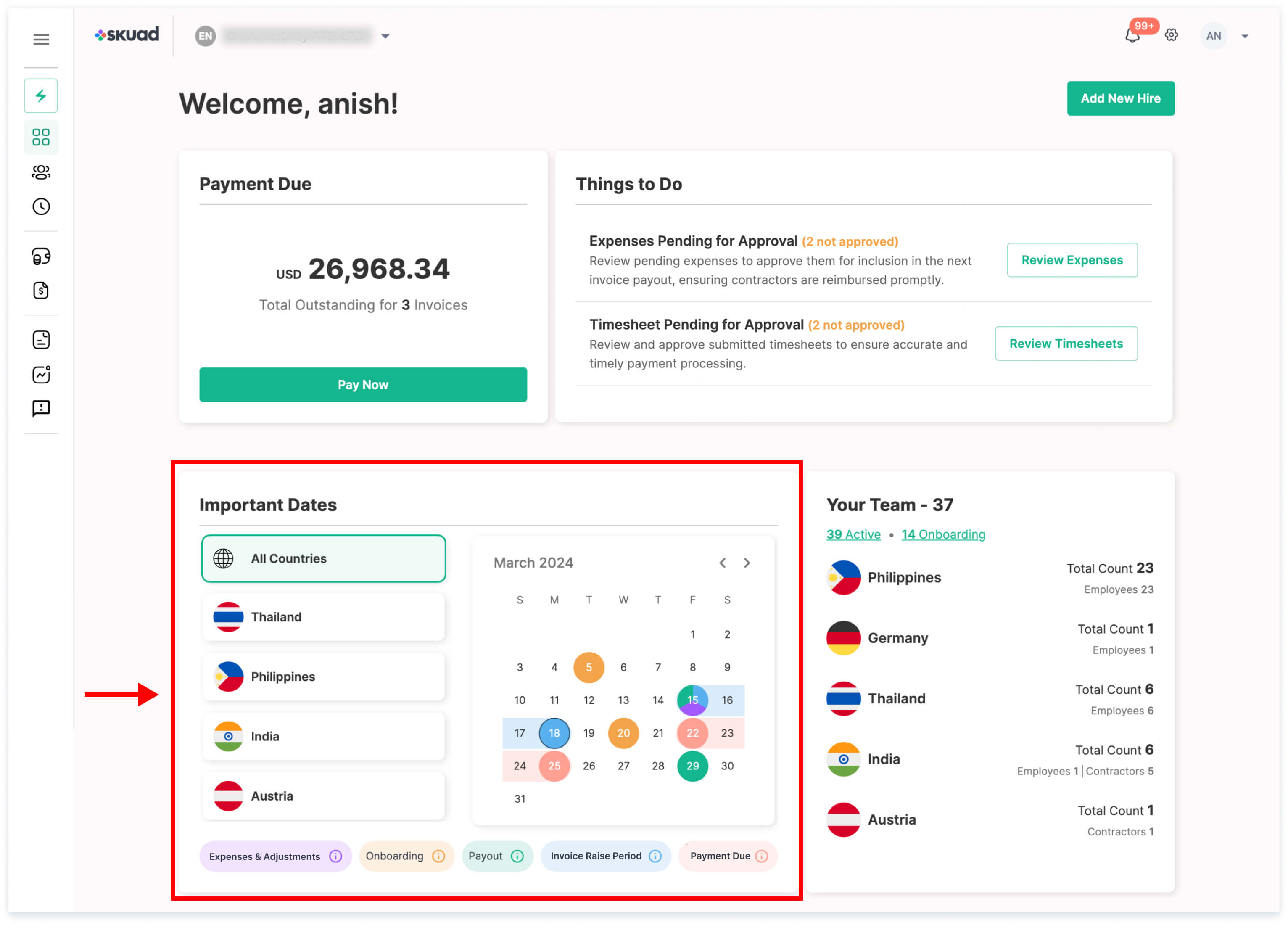 Important dates: The calendar on the dashboard gives you a quick snapshot of the important dates for each country where you have onboarded talent. Key dates which are available for you to view for each country are: